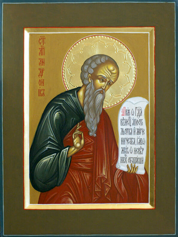Један од Седамдесеторице. Сродник апостола Павла, као што сам Павле пише (Рм 16, 7), спомињући и свету Јунију, помоћницу Андроникову. Андроник би постављен за епископа Паноније, но не становаше на једном месту, него проповедаше Јеванђеље по целој Панонији. Са светом Јунијом он успе да многе приведе Христу и да разори многе храмове идолске. Имађаху обоје благодатну силу чудотворства, којом демоне изгоњаху из људи и исцељиваху сваку немоћ и сваку болест. Пострадаше обоје за Христа, и тако примише двострук венац: и апостолства и мучеништва. Њихове свете мошти нађене су у пределима Евгенијским (в. 22. фебруар).