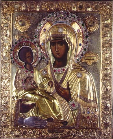 Ова света и чудотворна икона Пресвете Богородице, звана „Тројеручица“, припадала је најпре светом Јовану Дамаскину. Када безбожни иконоборни цар Лав III Исавријанац (717- 741 г.) оклевета овог светог Јована, који беше ревносни заштитник светих икона, пред дамаским халифом (кнезом) за тобожњу издају државе и владара дамаског, халиф казни светог Јована јавним отсецањем његове десне руке.