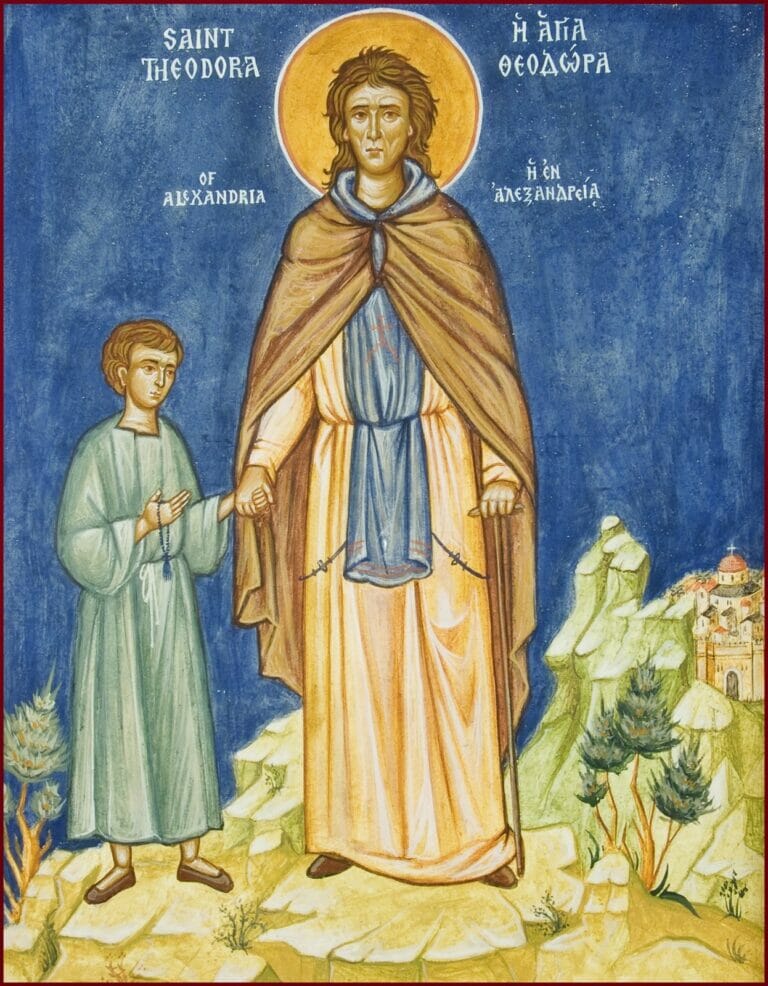 Из Александрије, жена младога мужа. Наговорена неком врачаром она учини прељубу с другим неким човеком. И одмах је поче савест љуто гристи. Ошиша се и обуче у мушко одело, па ступи у мушки манастир Октодекат под мушким именом – Теодор. Њен труд, пост, бдење, понизност и плачно покајање задивили су сву братију. Оклеветана од неке блудне девице, као да је с њом затруднела, Теодора се није хтела правдати сматрајући ту клевету као казну Божју за свој ранији грех. Изгнана из манастира она 7 година проведе пребијајући се по шуми и пустињи, и још уз то негујући дете оне блуднице. Победила сва вражја искушења: није се хтела поклонити сатани, није хтела примити јело из руку једног војника, није хтела слушати савете свога мужа да се врати к њему – јер све је то био само призрак ђаволски, и чим се Теодора прекрстила крстом, све је ишчезавало као дим. После 7 година прими је игуман у манастир, где проживе још 2 године, па се упокоји у Господу. Тек тада познаше монаси, да је то била жена; а игуману се јави ангел и објасни му све. Њен муж тада дође на сахрану, и оста до смрти у келији своје бивше жене. Св. Теодора имаше превелику благодат Божју: зверове укроћаваше, болести исцељаваше, воду у сухом бунару изведе. Тако Бог прослави истинску покајницу, која са јуначким трпљењем 9 година кајаше само један свој грех. Упокојила се 490. год.