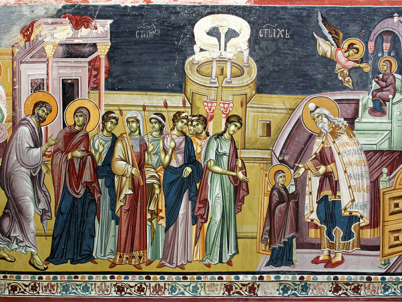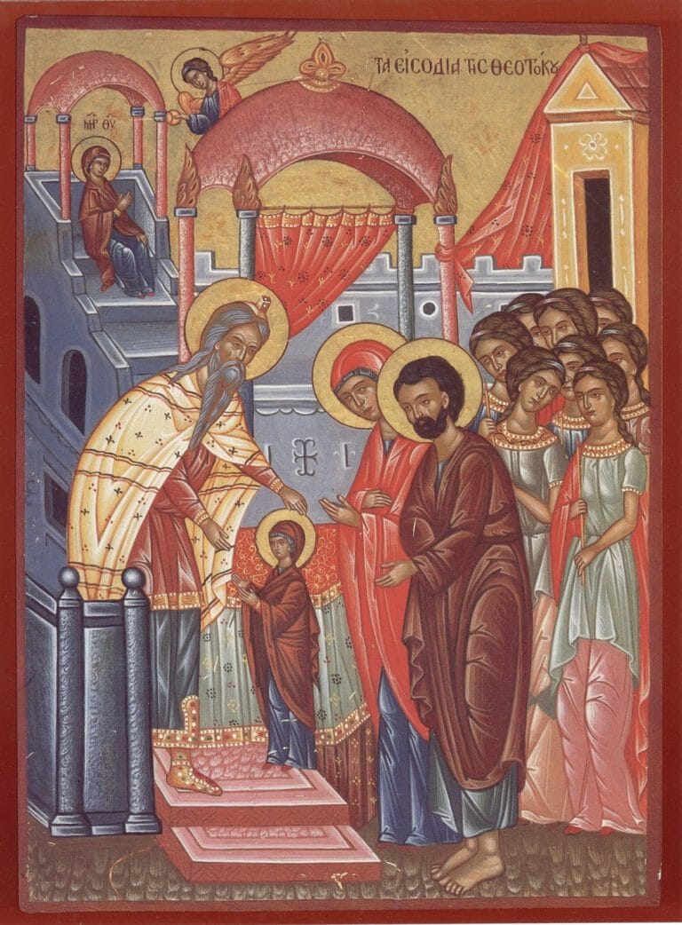 Када се Пресветој Дјеви Марији навршише три године од рођења, доведоше је родитељи њени свети, Јоаким и Ана, из Назарета у Јерусалим, да је предаду Богу на службу према ранијем обећању своме. Три дана пута има од Назарета до Јерусалима; но идући на богоугодно дело тај пут не беше им тежак. Сабраше се и многи сродници Јоакимови и Анини, да узму учешћа у овој светковини, у којој узимаху учешћа невидљиво и ангели Божји. Напред иђаху девице са запаљеним свећама у рукама, па онда Пресвета Дјева, вођена с једне стране оцем својим а с друге мајком. Беше Дјева украшена царским благољепним одећама и украсима, како и приличи кћери царевој, невести Божјој. За њима последоваше множина сродника и пријатеља, сви са запаљеним свећама. Пред храмом беше 15 степена. Родитељи дигоше Дјеву на први степен, а она онда сама брзо узиђе до врха, где је срете првосвештеник Захарија, отац св. Јована Претече, и узевши је за руку уведе је, не само у храм, него у Святая святыхъ, у Светињу над Светињама, у коју нико никада не улажаше осим архијереја, и то једанпут годишње. Св. Теофилакт Охридски вели, да је Захарија „ван себе био и Богом обузет“ када је Дјеву уводио у најсветије место храма, иза друге завесе, иначе се не би могао овај поступак његов објаснити. Тада родитељи принесоше жртву Богу, према закону, примише благослов од свештеника, и вратише се дома, а Пресвета Дјева оста при храму. И пребиваше она при храму пуних 9 година. Док јој беху родитељи живи посећиваху је често, а нарочито блажена Ана. Када пак родитељи њени беху Богом одазвани из овога света, Пресвета Дјева оста као сироче, и не жељаше никако до смрти удаљавати се из храма нити ступати у брак. Како то беше противно и закону и обичају у Израиљу, то она по навршетку 12 година би дата св. Јосифу, сроднику своме у Назарет, да под видом обручнице живи у девствености, те тако и да своју жељу испуни и привидно закон задовољи. Јер у то време не знаде се у Израиљу за девојке завештане на девство до краја живота. Пресвета Дјева Марија беше прва таква доживотно завештана девојка, и њој после следоваху у цркви Христовој хиљаде и хиљаде девственица и девственика.