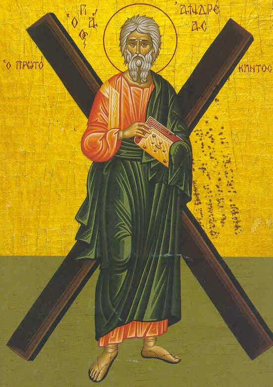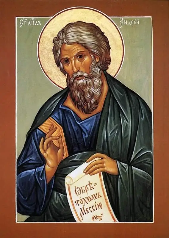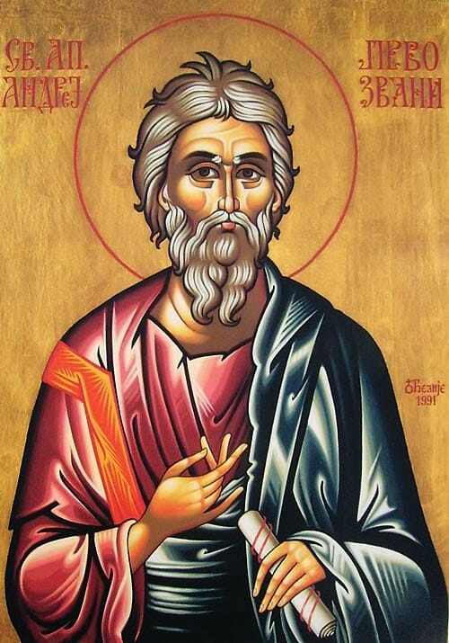 Син Јонин и брат Петров, родом из Витсаиде, и рибар по занимању. Најпре је био учеником св. Јована Крститеља, но када св. Јован указа прстом на Господа Исуса говорећи: гле, јагње Божје! (Јов. 1, 36), тада св. Андреја остави свога првога учитеља и пође за Исусом. По том Андреја приведе свога брата Петра ка Господу. По силаску Св. Духа паде у део овоме првом апостолу Христовом, св. Андреји, да проповеда Јеванђеље у Византији и Тракији, по том у земљама Дунавским, па у Русији и око Црног Мора, и најзад у Епиру, Грчкој и Пелопонезу, где и пострада. У Византији постави првога епископа у лицу св. Стахија; у Кијеву пободе крст на висини и прорече сјајну хришћанску будућност народу руском; по Тракији, Епиру, Грчкој и Пелопонезу преведе мноштво народа у веру, и постави им епископе и свештенике. У граду Патрасу учини многа чудеса именом Христовим и задоби многе за Господа, међу којима беху брат и жена царског намесника Егеата. Егеат разјарен због тога стави Андреју светога на муке, а потом распе на крсту. Докле год беше жив на крсту апостол Христов говораше корисне поуке хришћанима, који се беху сабрали око крста његова. Хтеде га народ скинути с крста, но он се опре томе. Најзад се апостол поче молити Богу, и при том нека необична светлост обасја га целог. То светлосно обасјање трајаше пола сата, и када оно ишчезе, апостол предаде своју свету душу Богу. Тако сконча свој земни век првозвани апостол, који први од 12 великих апостола позна Господа и пође за Њим. Пострада св. Андреја за свога Господа 62. године. Мошти његове беху пренете у Цариград. Доцније глава му је пренета у Рим, а једна рука у Москву.