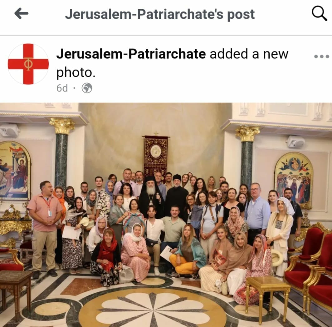 Свечани пријем и благослов Његове Светости, Патријарха јерусалимског, Г.Г. Теофила III, добили смо у петак 9. септембра у 11:30 часова. Са нама је била такође група ходочасника из Грчке и Бугарске. Патријарх је говорио о важности посете Светој земљи јер тиме се враћамо својим изворима духовности и православља. Такође својим доласком помажемо малобројно духовно стадо православних хришћана а за узврат, ходочасници добијају неописиву радост и благодатно богоусмерење свог живота. Након уручења обострано поклона и групног сликања, по благослову Патријарха Теофила III, отпевали смо му по Мокрањцу: ”Ис пола ети деспота” док је он достојанствено напуштао свечану салу Јерусалимске патријаршије.